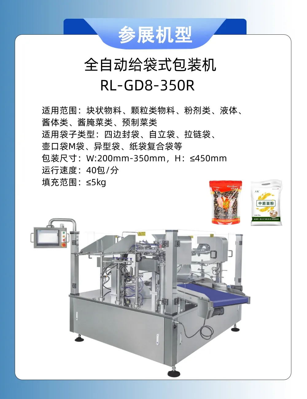 浙江潤(rùn)立智能科技有限公司提供粉末包裝機(jī)、 給袋式包裝機(jī)、全自動(dòng)包裝機(jī)、自動(dòng)顆粒包裝機(jī)、液體包裝機(jī)、醬腌菜包裝機(jī)、自動(dòng)食品包裝機(jī),推薦選用以下產(chǎn)品